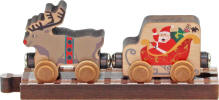 NameTrains Santa & Reindeer Set contains Rudy Reindeer and Santa's Sleigh on a 6" straight piece of track. Individual cars measure about 2.8" long by 2" high each and have a non-toxic finish. Track is sanded smooth and is detailed with a colorful, non-toxic print. All pieces are crafted from locally sourced, sustainably harvested hardwood and are compatible with our and other wooden railway systems.